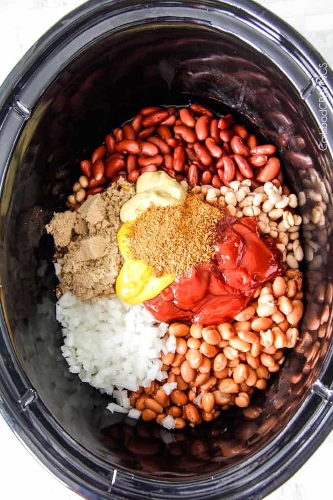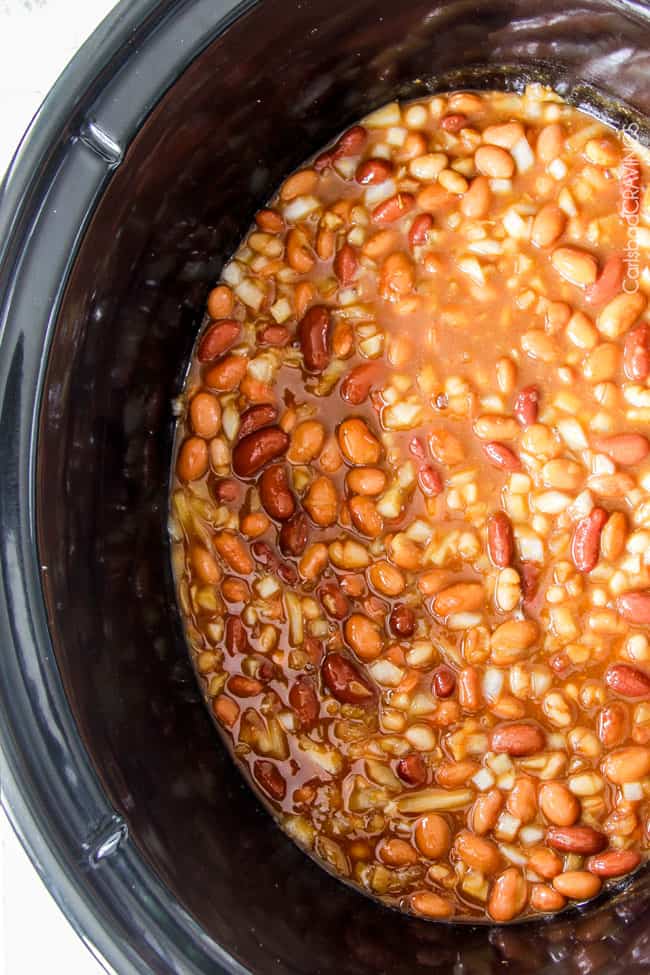 - Add all of the Hawaiian Barbecue Baked Beans ingredients to your slow cooker and mix to combine.