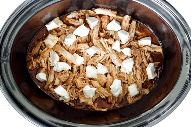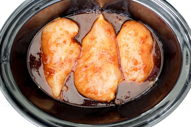 - Add ingredients to slow cooker.ย Add half of this sauce to the slow cooker along with the chicken. ย