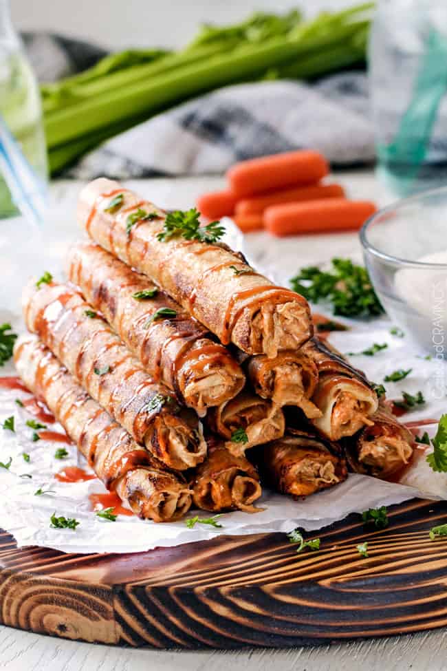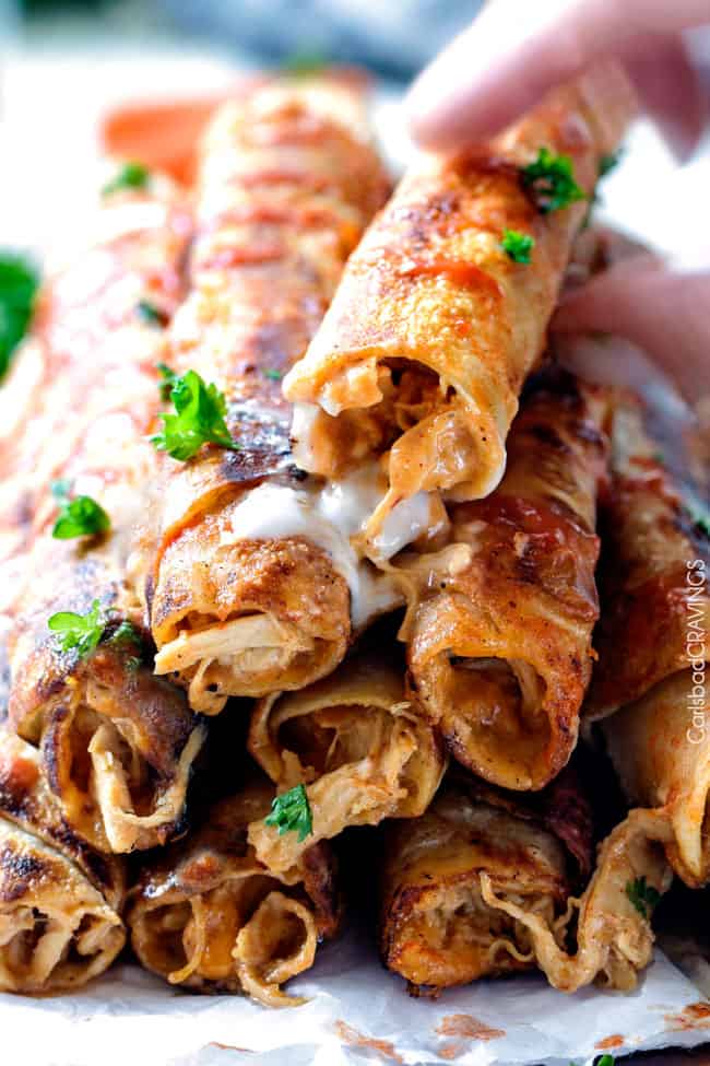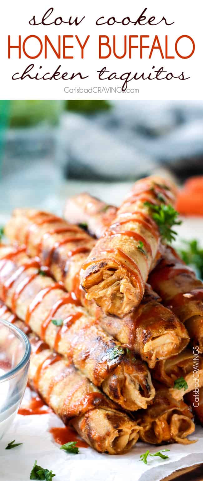 After Iย posted my Slow Cooker Honey Buffalo Meatballs, I was so in love with the tantalizing sauce, Iโve been trying to think of what more I could do with it โ aside from drink it โ light bulb โ Honey Buffalo Chicken Taquitos! ย Positively addicting light bulb โ ย as in I made this chicken taquitos recipe twice in one week because I couldnโt get the almost too-good-to-be-true-craving out of my mind, my belly, my soul. ย