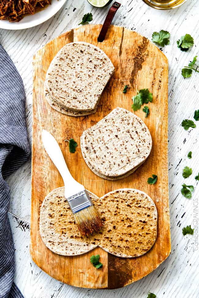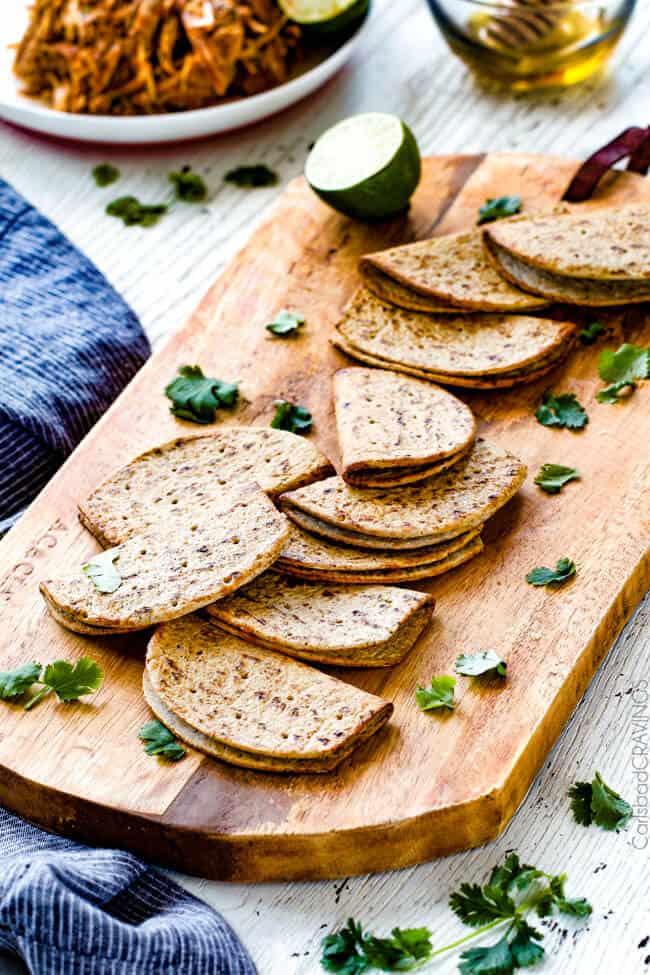 But these arenโt just any tacos, these are mini taco shells made of guilt-free Flatout Foldit Ancient Grains Flatbread that get brushed with the seasoned juices from your slow cooker then hung on the oven rungs and baked to golden crispy taco perfection (see video of techniqueย HERE, and start dreaming of the seasoned taco shell possibilities! ย BBQ Sauce,ย Pesto, Buffalo Sauce, etc.). ย The shells are hearty, crispy on the outside while still tender on the inside, perfect to cocoon Salsa Verde Honey Lime Chicken piled high with cheese, lettuce, tomatoes, avocados, sour cream. ย And perfect to eat 5 in one sitting. ย At least.