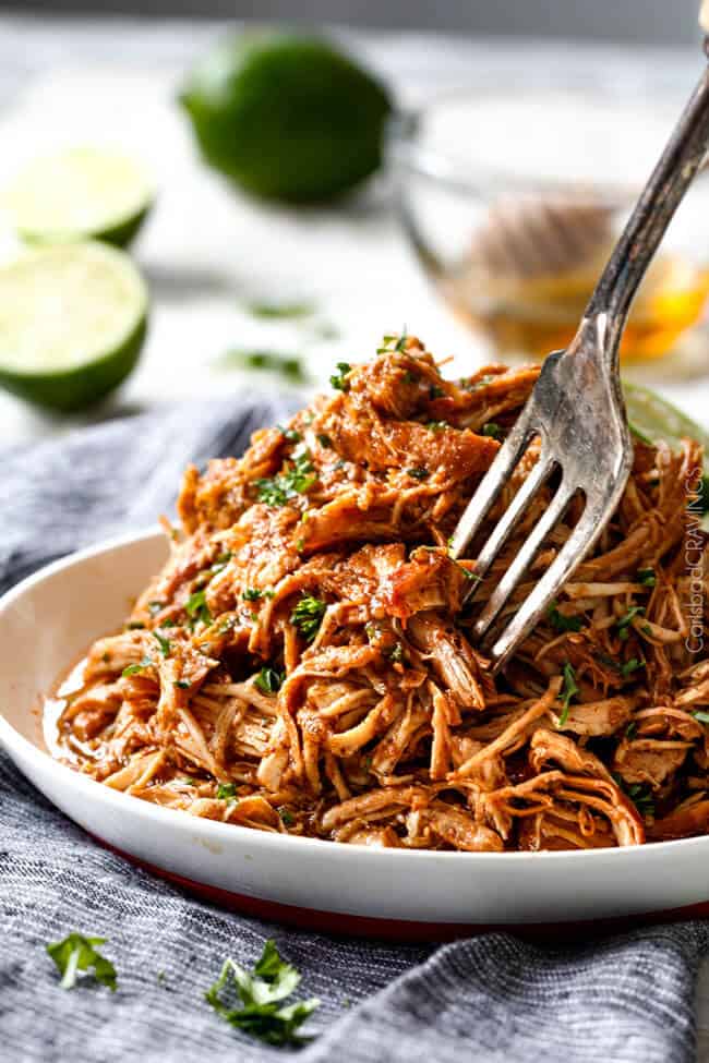 My favorite recipe ever!! Iโve made this about 10 times now. Fresh lime juice is best, and I never end up needing the whole amount. I leave it in the juice after its shredded for as long as possible! Good on rice, in a taco, or added into chili.
