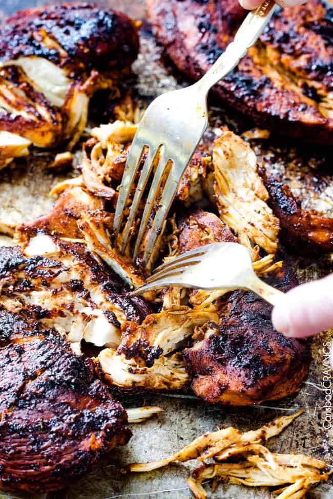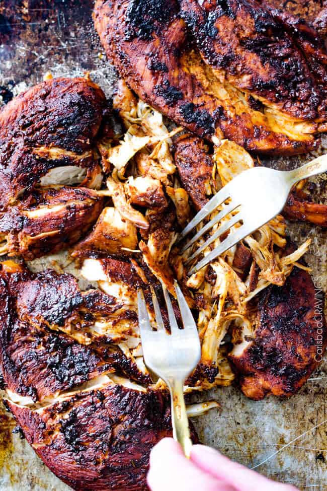 - To easily cook and shred the chicken: Heat 1 tablespoon olive oil in a large nonstick skillet over medium-high heat until hot and rippling. Add the chicken breasts (and any extra marinade) and cook for 3-5 minutes, or until golden brown on one side. Flip the chicken over, then add 1 cup of chicken broth or water to the skillet. Cover and reduce heat to medium and simmer 15-20 minutes or until chicken is cooked though and tender enough to shred, adding additional chicken broth/water if the liquid evaporates too quickly. Remove chicken from skillet and let rest 5 minutes before shredding.