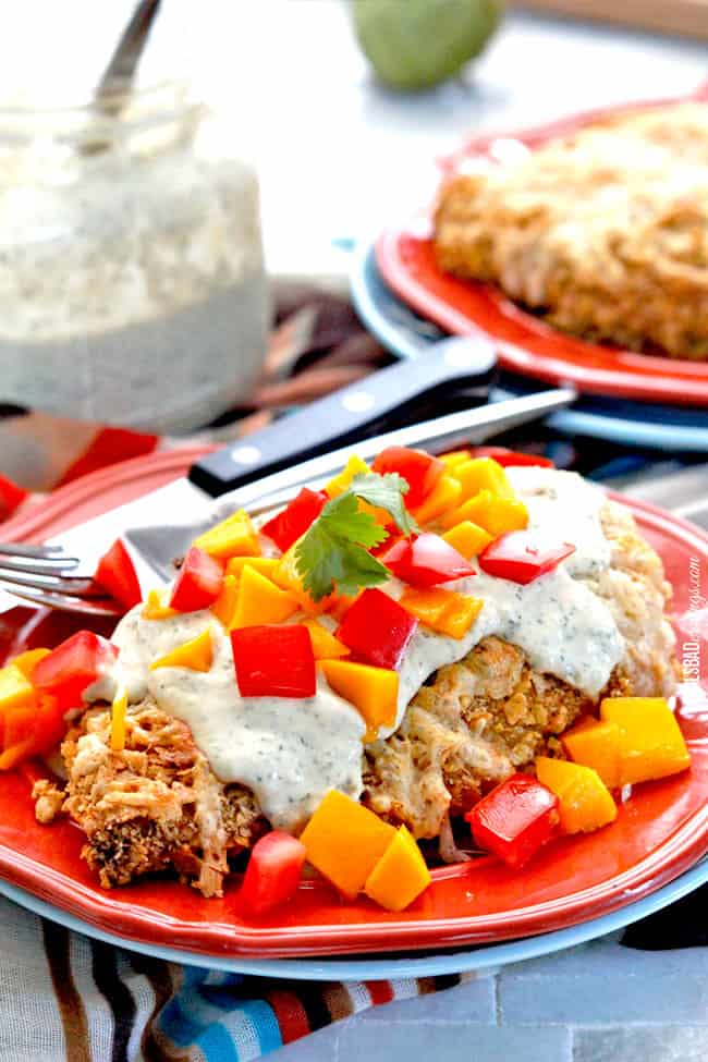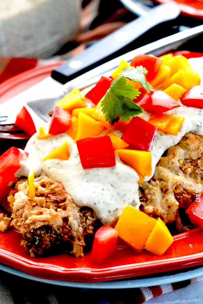 The chicken is then smothered in Tomatillo Avocado Ranch Dressing.ย ย A creamy ranch packed withย tomatillos, avocado, jalapeno, garlic, cilantro and smoked paprika. ย A creamy ranch so dreamy its earned its place smothering this chicken.