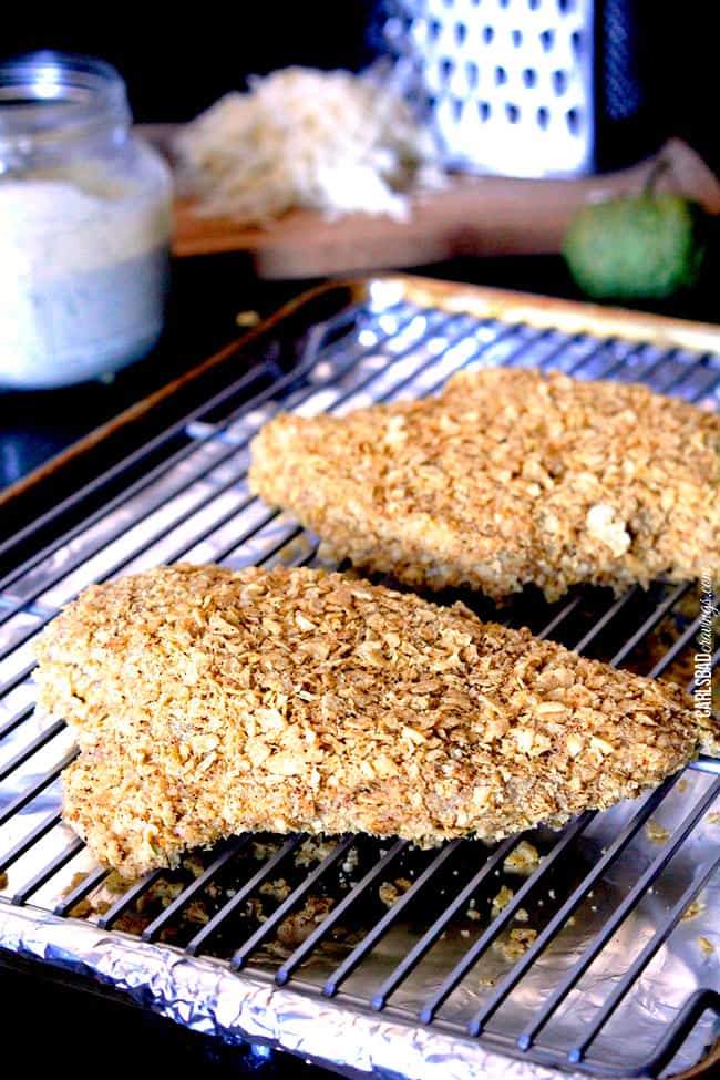 - Remove chicken from marinade then dredge in the chip mixture, pressing chips into chicken to securely coat. Place chicken on the baking rack and bake for 25-30 minutes or until the chicken is cooked all the way through. Top chicken with an additional ยผ cup cheese per breast (more or less to liking) and broil until golden.