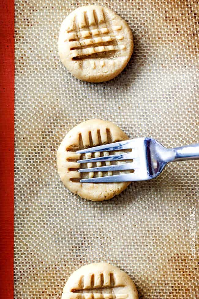 The criss-cross pattern on peanut butter cookies helps flatten the cookie so they bake evenly, otherwise, theyโll stay more or less in ball shape.ย I guess you could flatten them slightly with a glass โ but whereโs the fun in that?!