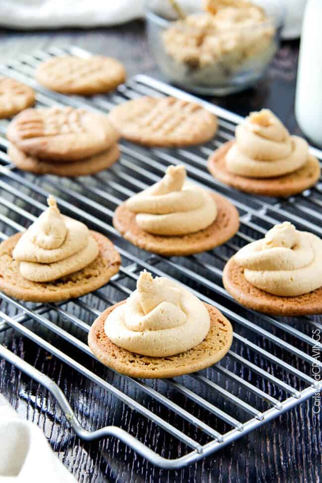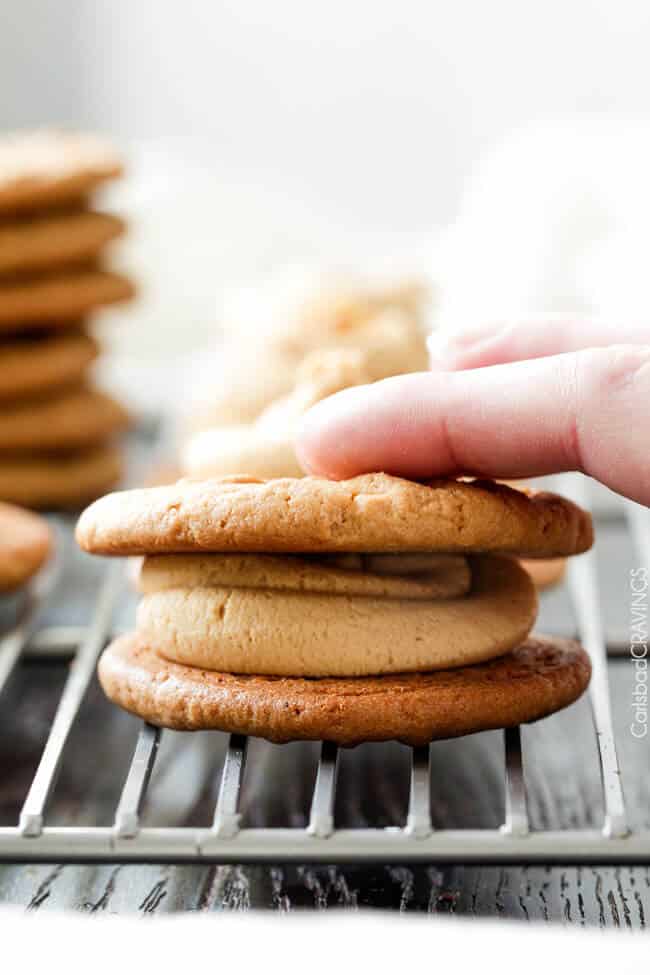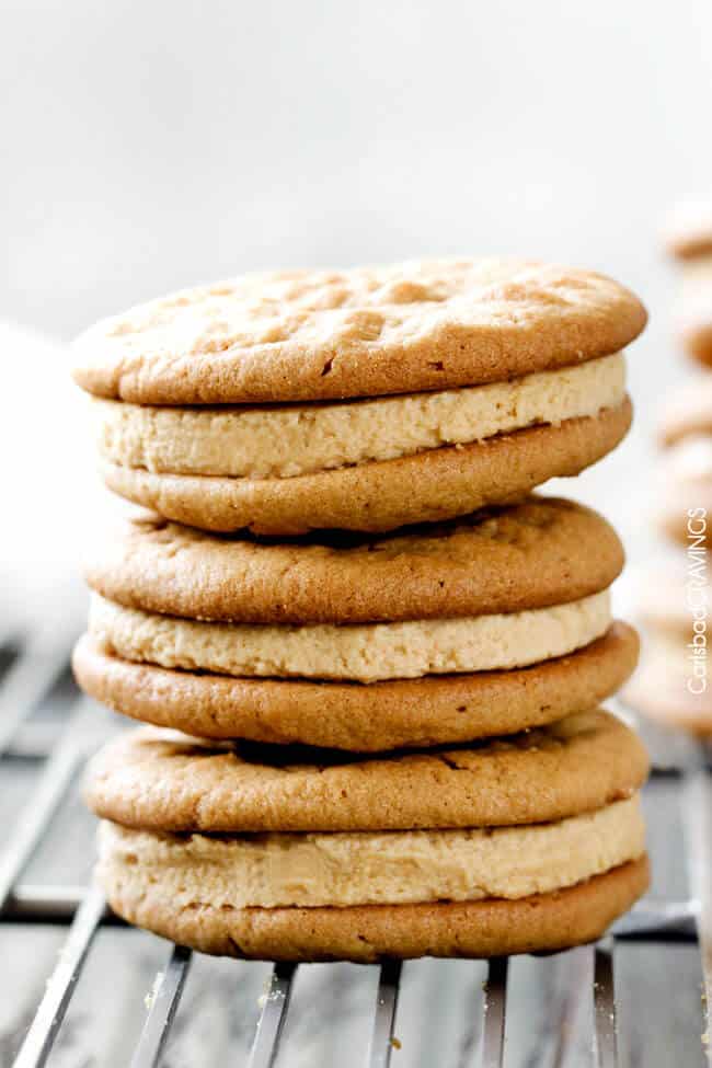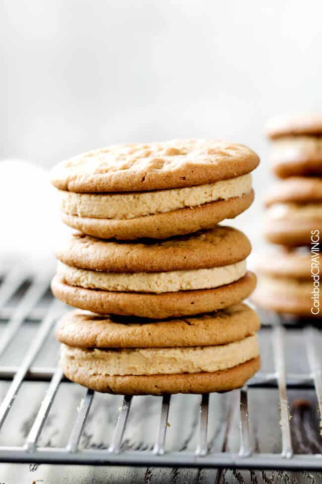 I used the same Peanut Butter Cookie recipe that I used in my Sea Salt Oreo Stuffed Peanut Butter Cookies (insane if you havenโt tried them!) because the cookies are so soft and chewy and just scrumptious and then proceeded to layer the cookies with dreamy peanut butter cream.