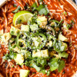 Sopa de fideo is one of the easiest and tastiest dinners youโll ever make! Fideo is a robust, savory soup made with thin fideo pasta (like short vermicelli), simmered in a robust, rich, smoky, tomato-based broth dressed with cilantro and lime juice. ย ย The whole meal cooks up quickly making it a perfect weeknight dinner or satisfying Sunday lunch.ย You can keep the fideo recipe extremely simple or use it as a springboard for any add-ins such as corn, zucchini, leftover rotisserie chicken, etc. Dress up your big bowl of comforting, hearty fideo with crumbled cotija, Mexican crema and jalapenos and you have a quick Mexican soup that you will make again and again!
