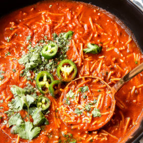 Fideo soup boasts a tomato-based broth and is packed with fresh flavor from the cilantro and lime. ย Itโs made by sautรฉing fideo noodles until golden then blending tomatoes, onions, garlic, broth and sometimes jalapenos together and pouring it over the noodles then simmering everything together in one pot until the noodles are tender and much of the sauce is absorbed.