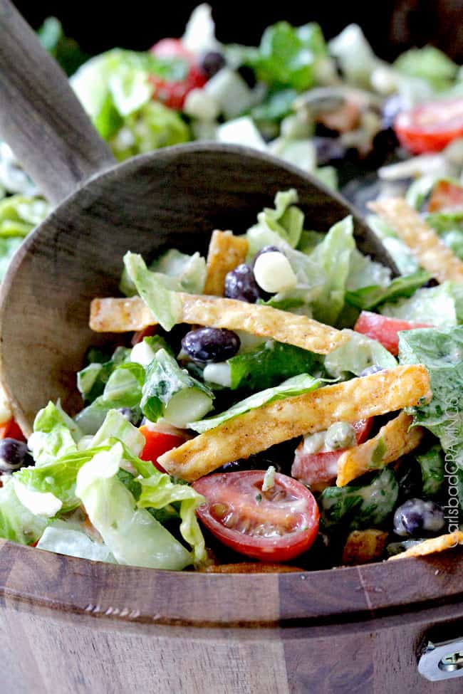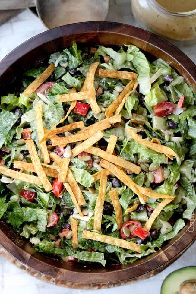 - If you expect leftovers: ย add all of the salad ingredients to a large bowl except the tortilla strips. ย Let individuals dress their own salad plates with dressings and tortilla chips.
