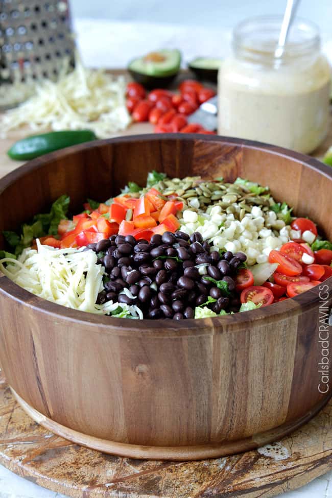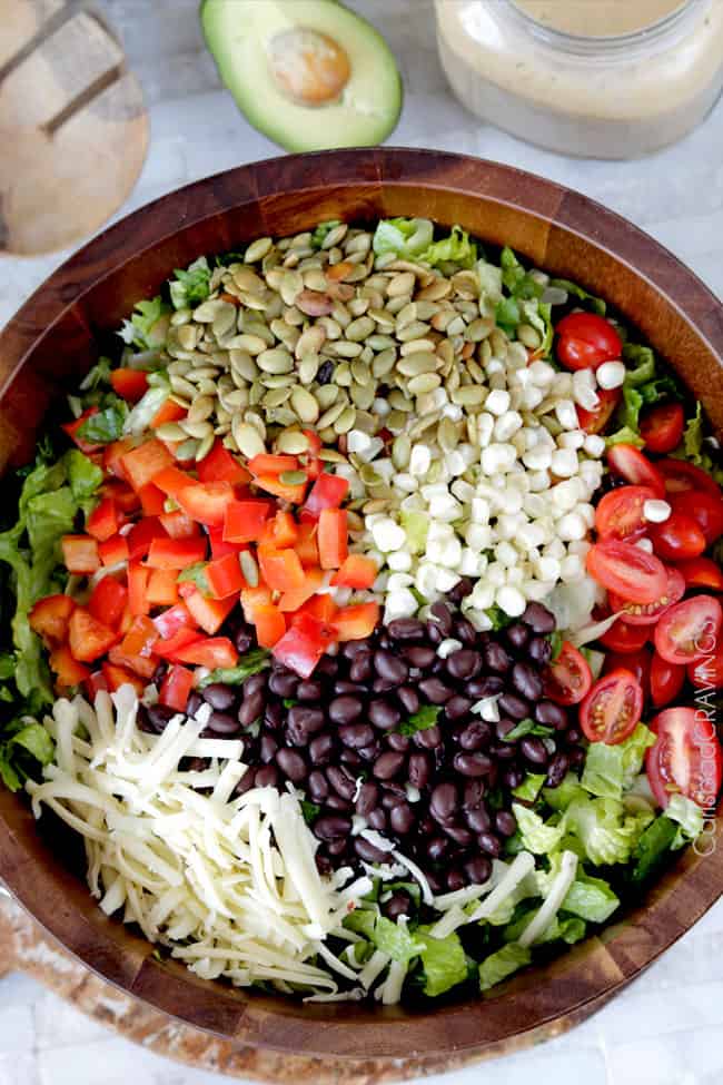 - Texture heaven. I learned a long time ago that the best salads have TONS of texture.ย Every salad needs a nut or seed, crunchy veggies and cheese.ย ย And this Southwest Salad is loaded with them.