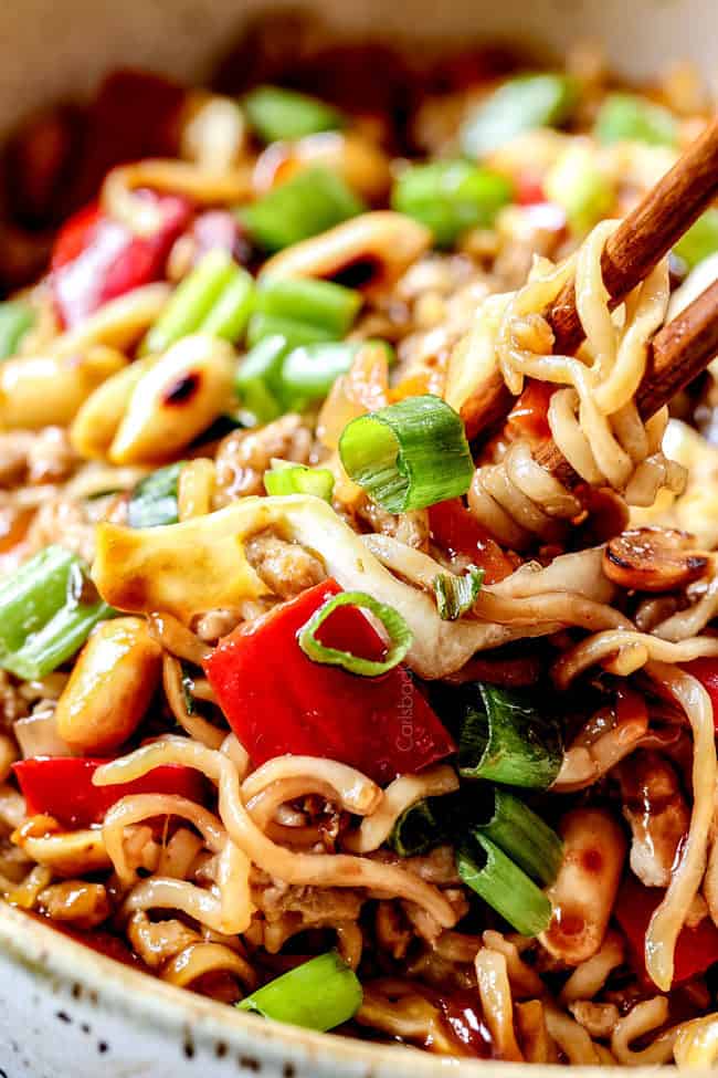 This Spicy Ramen Noodles recipe is inspired by what Patrick and I eat all the time โ€“ stir fried ramen with peanuts!ย  Itโ€™s one of our go-to dinner concoctions that Iโ€™ve never actually written down until now.