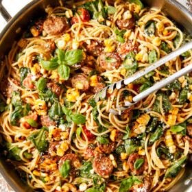 This Spinach Pasta is a vibrant yet creamy dish packed with fresh summer veggies, Italian chicken sausage, and a luscious garlic-basil Parmesan sauce which has readers raving: โSO delicious and easy!! โOh wow this dish is incredible! The sauce is wonderful.โ โMy husband says this is as good as any restaurant dish,โ โAwesome blend of summer flavors without being too heavy!โ