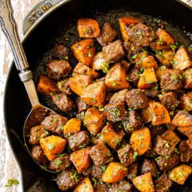 This steak and potatoes recipe is gourmet delicious yet simple enough for everyday! Juicy, steak and potatoes are tossed in a sensational spice rub then pan-seared with garlic herb butter for an explosion of YUM in every bite. Itโs a one-skillet wonder thatโs quick and easy yet couldnโt be any more comforting, satisfying or dripping with flavor. Serve this garlic butter steak and potatoes skillet with honey roasted carrots and wedge salad for the perfect easy dinner! Iโve included tips and tricks to achieve melt in your mouth, juicy, steak every time, how to prep ahead and how to freeze.