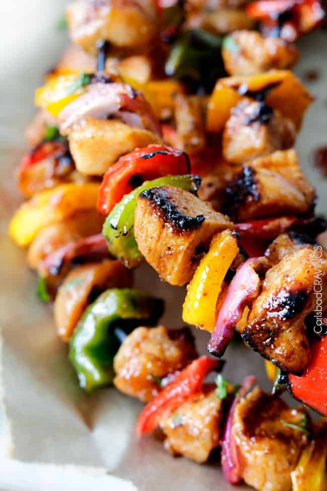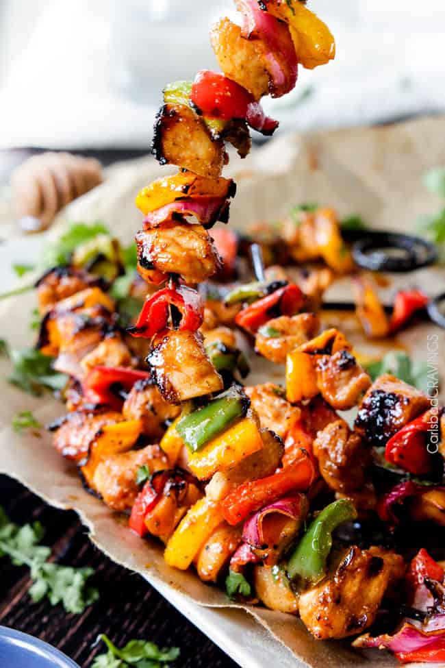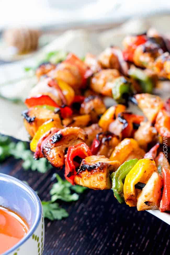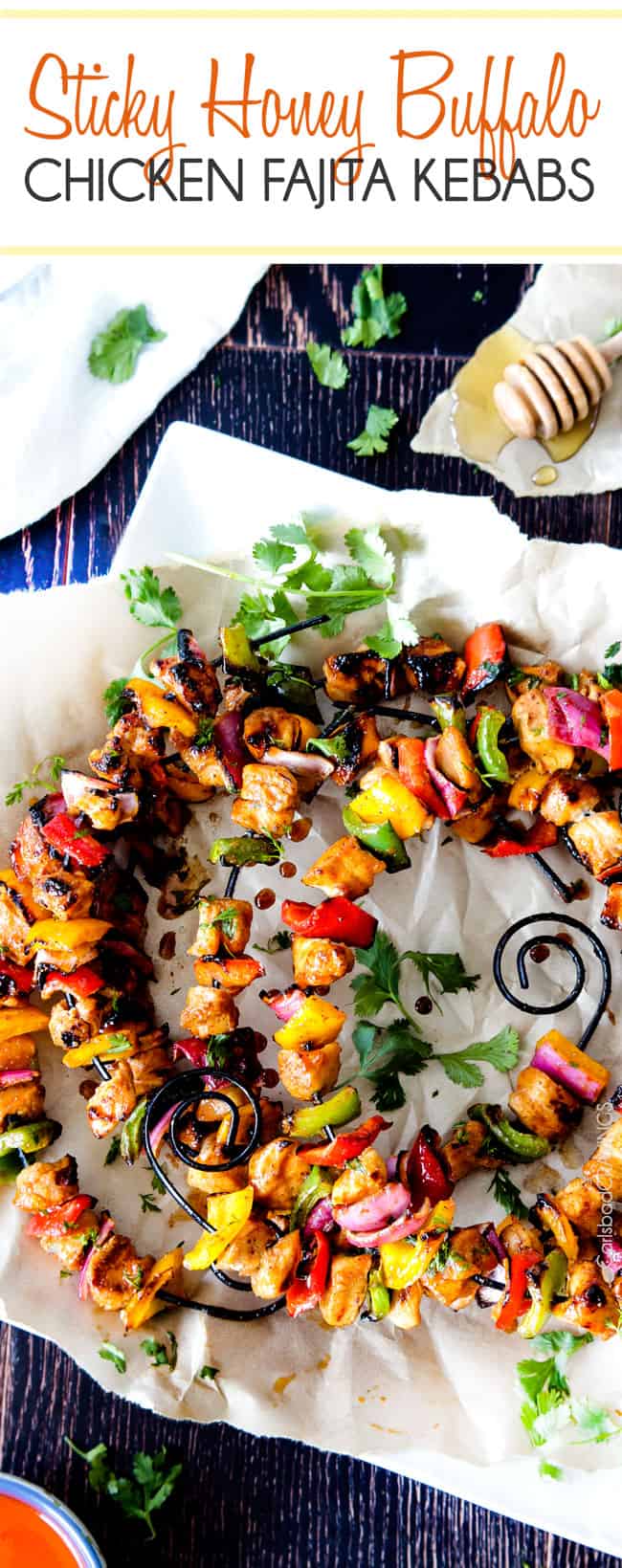 You let your chicken marinate in some of the sauce and after the chicken kebabs are grilled, you dunk and douse and smother your chicken fajita kebabs in the reserved sauce so every inch is sticky honey buffalo-icious. ย Because this sauce is amazing.ย And these kebabs are amazing.ย And you are amazing.ย And more amazing if you make these kebabs โ especially in the eyes of all that devour them.