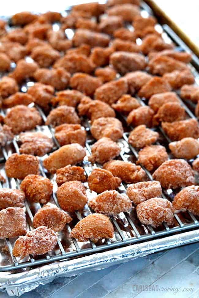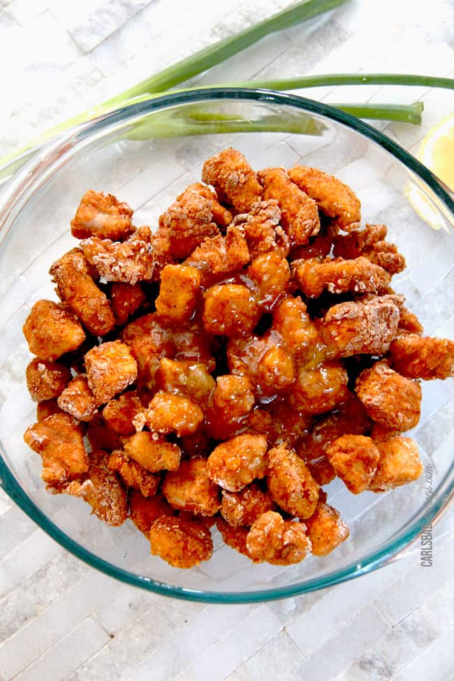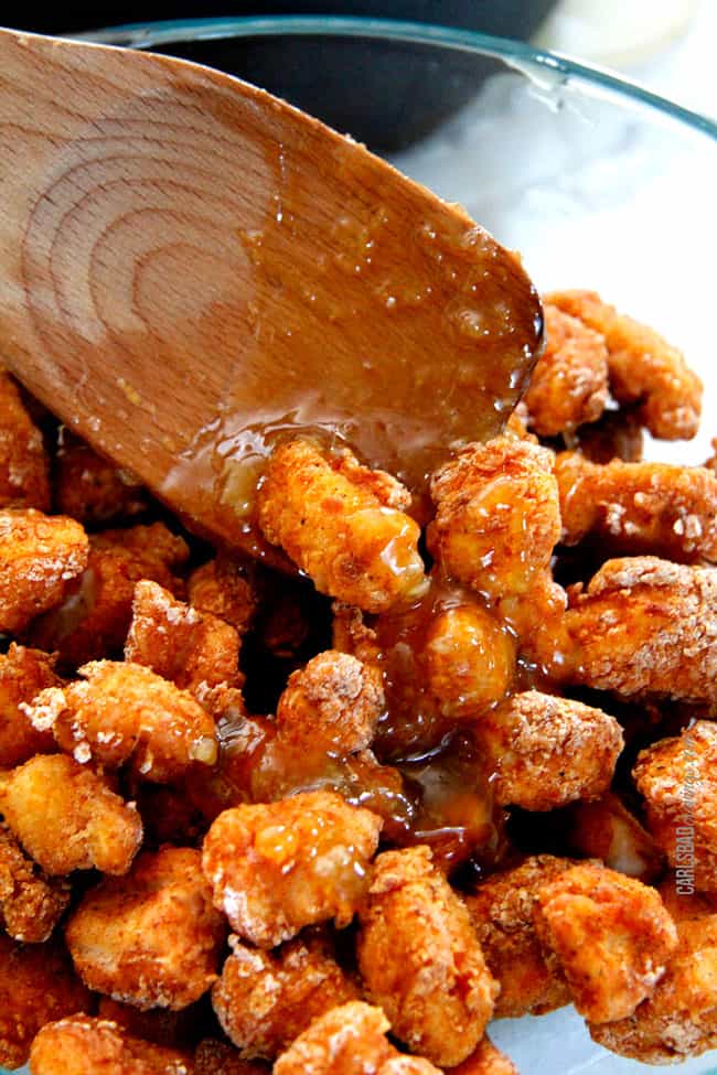 If you stir fry the Honey Lemon Chicken,ย swap the ratio of cornstarch and flour so you will have 1 cup cornstarch and 2 tablespoons flour.ย You can see my Honey Coconut Cashew Chicken as a reference (in that recipe I use a marinade and in this recipe we use an egg wash for the breading to stick).