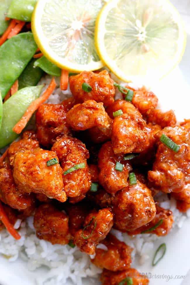 And I donโt blame him when Sticky Honey Lemon Chicken means a sweet honey sauce with a splash of citrus and a slight zing from the fresh gingerย smothering crispy, spiced and breaded ย baked chicken morsels.ย It is SO good, my sister-in-law texted me pictures of her family licking their plates clean!ย So this is officially โlick-the-plate-delicious!โ Chinese chicken!