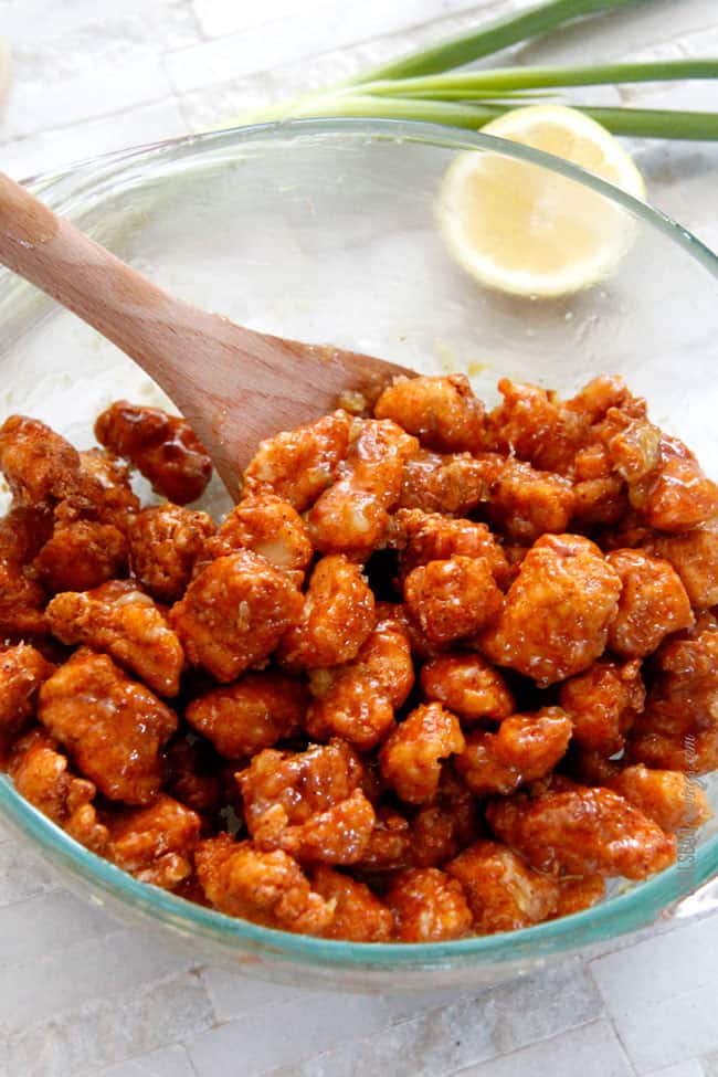 - In a large bowl, toss baked chicken with Honey Lemon Ginger Sauce using a spatula until evenly coated. It will seem like not enough sauce, but keep mixing until it covers all the chicken.