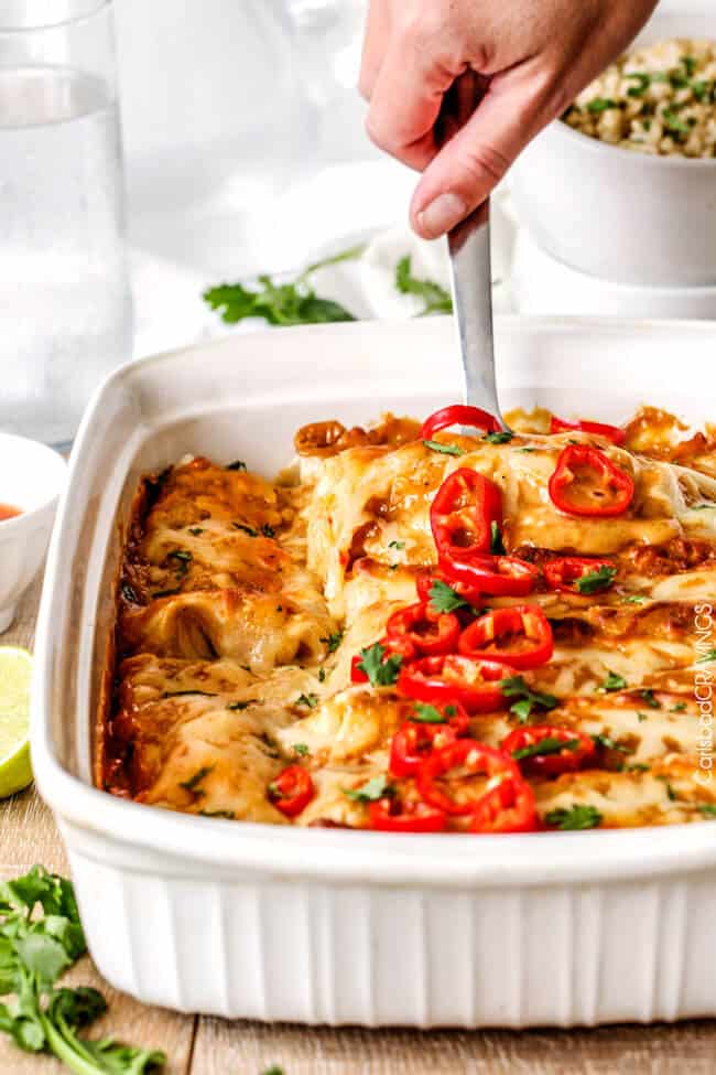 Asian Mexican fusion has to be one of my most favorite cuisines like myย ย Teriyaki Chicken Tacosย andย Asian Caramel Pulled Pork Tacos. ย The two cuisines might appear vastly different but they have strikingly similar flavor profiles (thus my two favs!:), that lend themselves beautifully to intermingling and creating unique, enticing flavor combinations like these delectable chili enchiladas!