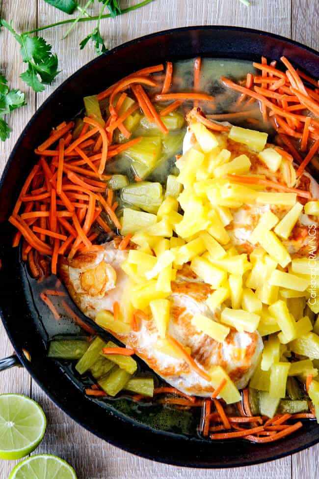 - Chicken: Heat 1 tablespoon olive oil in a large nonstick skillet over medium-high heat. Add chicken and cook 3-5 minutes, or until golden brown on one side. Flip chicken over and add the can of pineapple with juice to the skillet. Cover and reduce heat to medium and simmer 10 minutes, stirring pineapple occasionally, adding additional water if the liquid evaporates too quickly. Add carrots, cover and simmer 5-10 minutes more or until chicken shreds easily. Remove chicken and let rest for 5 minutes before shredding.