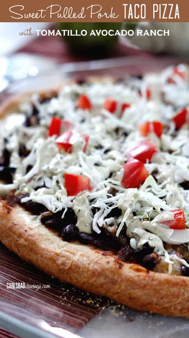 Sweet Pulled Pork Taco Pizza with Tomatillo Avocado Ranch