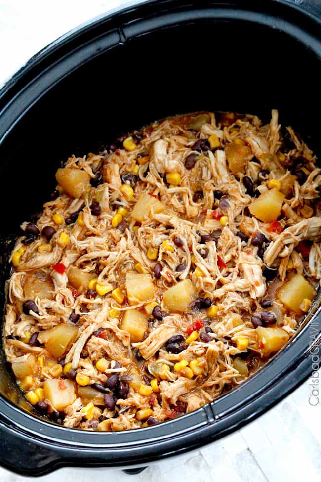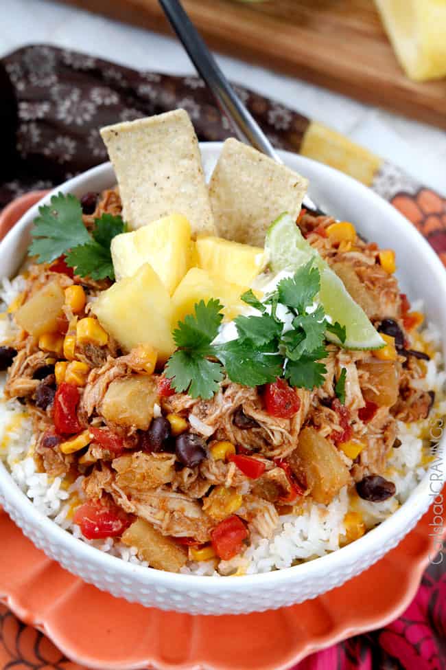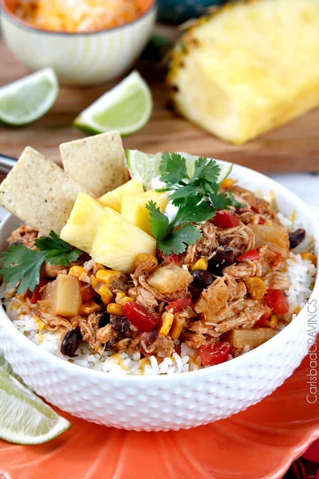 This Pineapple Salsa Chicken makes aย favoriteย filling in burritos or tacos but my personal favorite is to drain the liquid then use any excess liquid (plus needed water) to make rice, then pile rice, cheese, Pineapple Salsa Chicken, lettuce, sour cream and crushed chips for an out of this world burrito bowl. ย Lick your plate, your neighborโs plate, the serving plateย good.