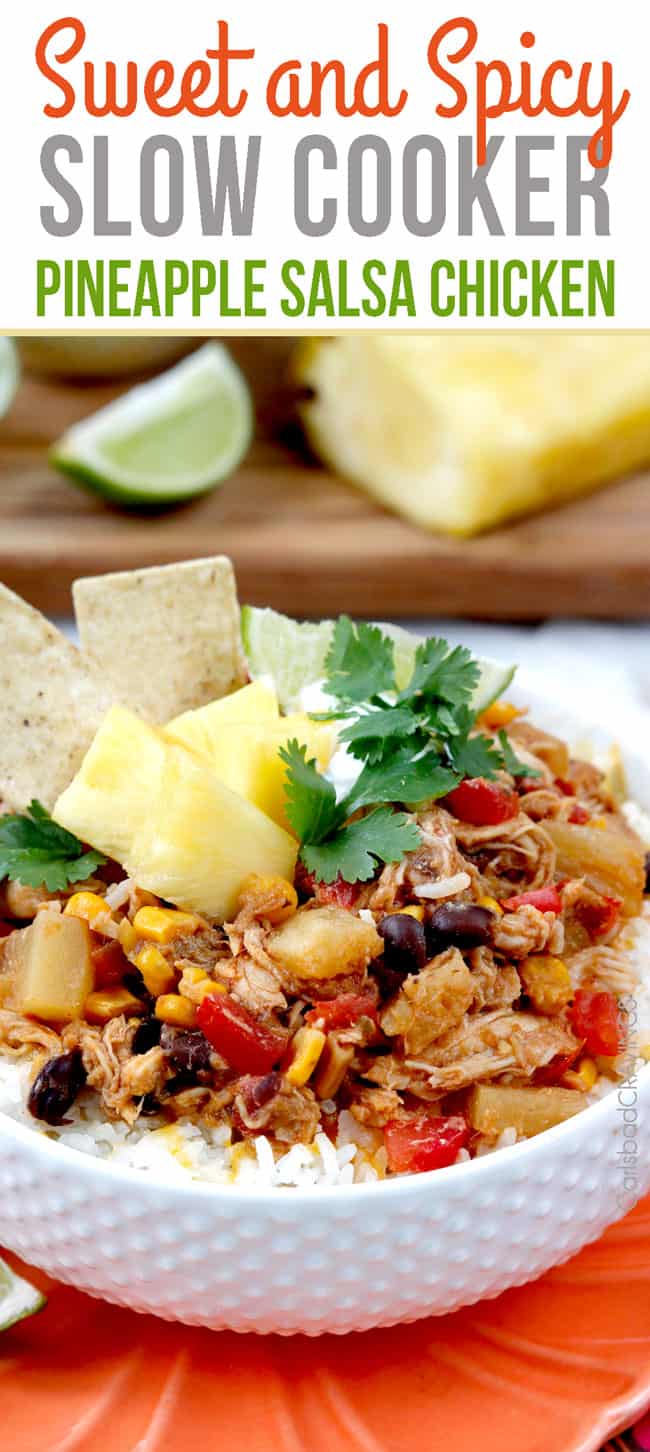 Happy official 2015! ย When I was deciding what to post for my first ever recipe in 2015, I wanted to post eitherย Asian or Mexican (my Top 2014 Recipes might have given you that hint ๐ ) โ because they are my two favorite food groups ย โ and I wanted something sweet and spicy โ because thatโs my favorite combo โ and although this sounds all about me so far, I alsoย thought about what YOU would absolutely love that is one of the easiest, most versatile meals, that you can dress up for company (I served this to friends last week) or simplyย serve withย rice and call it a day โ and my taste buds landed on Sweet and Spicy Pineapple Salsa Chicken โ slow cooker style.