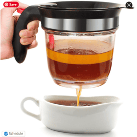 - Strain: Strain the turkey drippings from the roasting pan (solids and liquid) through a fine mesh sieve directly into a fat separator cup to skim off fat when poured OR a large freezer bag. Discard anything caught in the sieve.