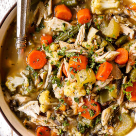 Turkey Rice Soup is also easy to make in the slow cooker!ย I would start with only 9 cups of broth and add more if needed when you add the cauliflower and turkey because the slow cooker doesnโt evaporate much broth like cooking on the stove does. To make Turkey Soup in the crockpot: