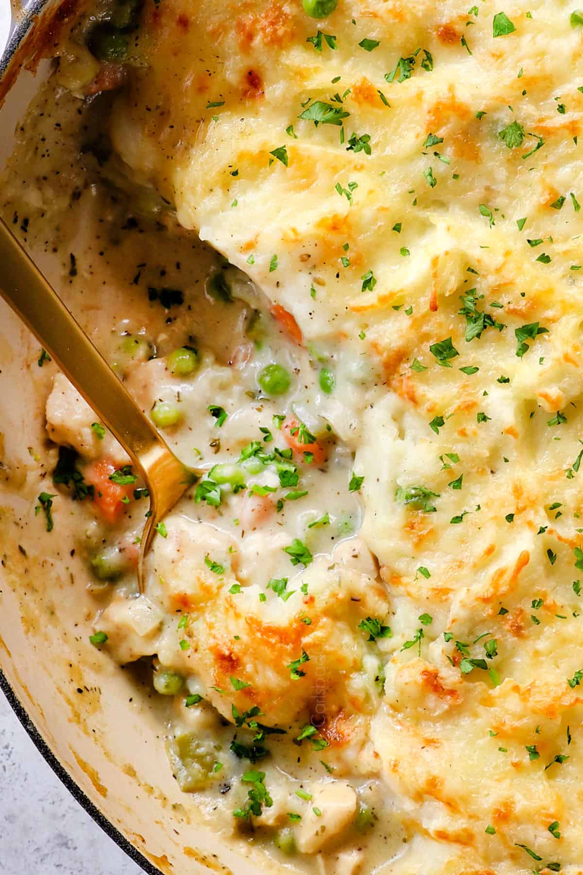 - Bake: Transfer to the oven and bake for 30 minutes or until the filling is bubbly and the cheese is completely melted. Broil for 1-2 minutes, or until the potato peaks are golden (watch closely so it doesn't burn!). Garnish with fresh parsley if desired before serving.