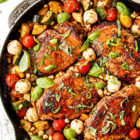 This Tuscan Chicken recipe is summer in a skillet! Itโs made with juicy, succulent Italian seasoned chicken, charred sweet corn, tender-crisp zucchini, bursting cherry tomatoes, and aromatic basil and garlic. ย The caramelized sweet corn with the fresh zucchini and juicy, sweet tomatoes is absolutely hypnotic. ย The whole skillet comes together in less than 40 minutes with only a 20-minute cook time. ย Keep this Tuscan Chicken naturally gluten free and low carb or serve it with brown rice, mashed potatoes and breadsticks.ย
