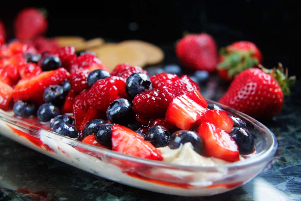 c) ย Itโs easy. ย Simply whip up the cheesecake ingredients, spread on a platter (no bake!) and top with berries mixed with berry jam. ย Thatโs IT!!!
