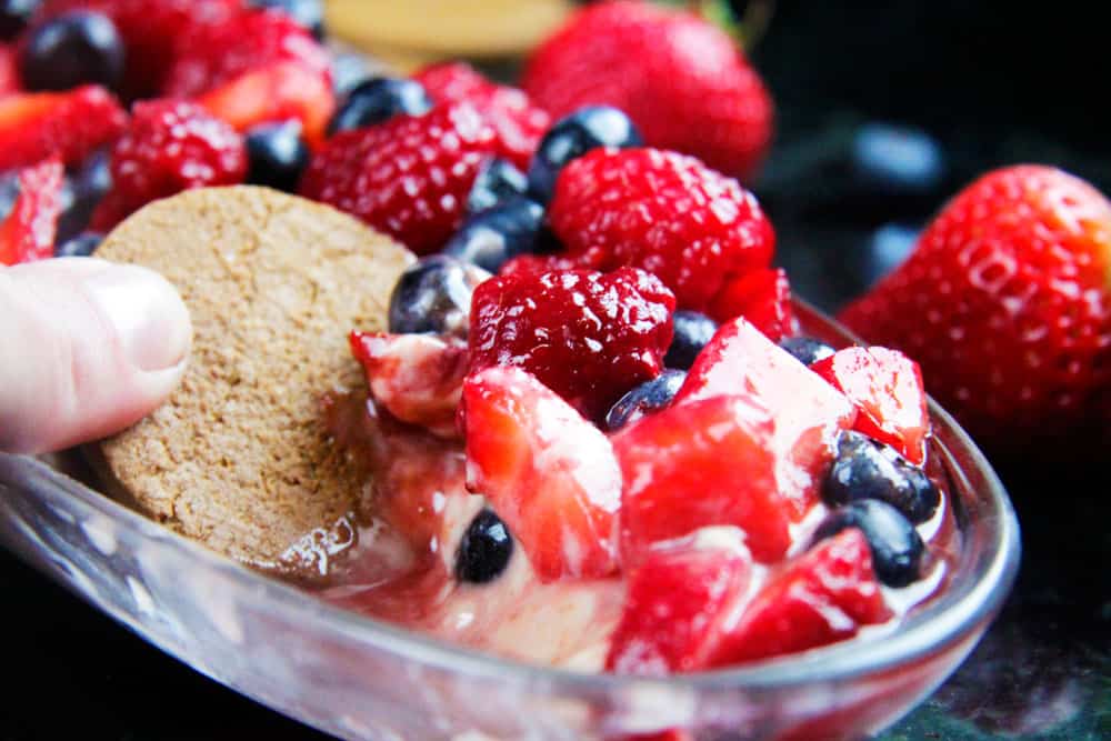 - When ready to serve, spoon berries over the cheesecake filling. Serve with gingersnaps (recommended unless you donโt like them), graham crackers, pretzels, vanilla oreos, etc.