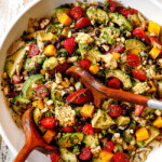his Avocado Chicken Salad is the ultimate, quick, easy, light lunch or dinner that also happens to be fresh, filling, healthy, flavorful, gluten-free and DIVIENLY delicious with ZERO mayo! This avocado chicken salad recipe is loaded with creamy avocados, tender rotisserie chicken, smokey grilled sweet corn, crunchy cucumbers, juicy tomatoes, hearty black beans, sweet mangos, and fresh strawberries all doused in tangy, garlicky mojo dressing that packs so much zesty, sassy flavor. The hearty chicken, avocado and veggies make it a meal and the sweetness of the mangos, strawberries and corn cut through the tangy dressing; it’s match made in foodie heaven. You can dress this avocado chicken salad up or down by adding more or less of your favorite ingredients. It’s also prep ahead friendly but so quick and easy you won’t need to!