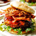 These BBQ Burgers are an amazingly juicy explosion of sweet, tangy, spicy, smokey, crispy deliciousness all at the same time. They’re smothered in homemade BBQ sauce, sharp cheddar, salty bacon, crispy lettuce, juicy tomatoes and crispy onion strings. Of course, all of the toppings are customizable to make it YOUR best burger recipe! I’ve included tips and tricks on how to cook burgers (grilled or stove top), how to make ahead and how to freeze and my secret to the JUCIEST burgers!
