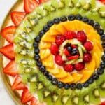 Decorate fruit pizza with fruit as desired: I recommend starting from the outside edges and working your way in with alternating fruits.