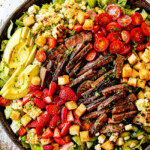 ASSEMBLE: Add chopped lettuce to a large salad bowl followed by all remaining salad ingredients except croutons. Season with freshly cracked salt and pepper. Top with sliced or chopped steak. You can either drizzle with dressing and toss OR drizzle dressing over individual plates. Garnish individual servings with croutons. Serve immediately.