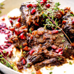 These braised short ribs will have your whole family drooling! They are juicy, succulent, rich and flavorful and deceptively easy to make even though they look like (and taste!) like the best fine dining has to offer. To make, simply sear the beef short ribs, sauté onions carrots and celery, add your braising liquid and herbs, then bake until tender while your home fills with the rich aroma of anticipation. What you will especially love is that this short ribs recipe tastes even better the next day! This allows you to easily remove the fat (no greasy short ribs!) and just reheat on the stove for 15 minutes AKA an ideal company or holiday dinner. Serve your short ribs over some garlic mashed potatoes and you have one of the easiest gourmet comfort foods you’ll ever make!v