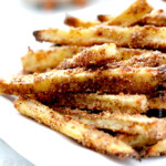 Evenly space sweet potatoes on prepared baking sheet so that they are not touching (otherwise they will steam instead of bake) and sprinkle any remaining brown sugar mixture over top. Bake on the upper middle rack for 20-25 minutes, rotating pan half way through so they bake evenly. When fries are cooked, broil 3-5 minutes, rotating half way through, or until golden and edges start to brown