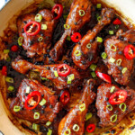 Asian sweet chili sauce, brown sugar, garlic and spices and then simmering the chicken in the marinade – how easy is that?! The marinade reduces to a delectable sticky sauce that envelops the chicken as your home fills with the intoxicating aroma of anticipation. The resulting Filipino Chicken Adobo is incredibly juicy, tender and exploding with flavor in every bite. Serve this effortless Chicken Adobo recipe with rice and veggies and watch everyone clamor for more.