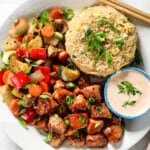 This Hibachi Chicken recipe is every bit as swoon worthy as Benihanas at a fraction of the price! The juicy, savory chicken is extra tender thanks to my “velveting” technique, the veggies are fresh, crisp tender and completely customizable, and the rice is buttery, umami fantastic with a kiss of toasted sesame oil. Marry the full-flavored trio together with creamy, tangy, slightly sweet and spicy Yum Yum Sauce and you can skip the takeout forever!