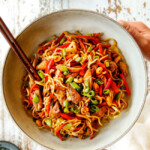 This Yakisoba recipe will cure your cravings for Asian takeout! Yakisoba is a popular Japanese noodle stir fry loaded with crisp-tender veggies and yakisoba noodles in a salty, sweet and savory sauce. This chicken yakisoba boasts the complex flavors of authentic yakisoba but is made with everyday ingredients and easy cooking techniques AKA it’s not authentic but it tastes like it! This yakisoba recipe is filled with yakisoba noodles, juicy chicken, julienned carrots, thinly sliced cabbage, crunchy bell peppers and aromatic garlic, ginger and green onions bathed in a fruity, spicy, sweet and tangy sauce. It is a symphony of tantalizing flavors and textures that’s easy to customize with whatever veggies or protein you have on hand. Add some potstickers and enjoy your own fakeout takeout feast at home!