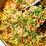 This chow mein noodles recipeis the healthier version of take-out, made with minimal oil in less than 20 minutes! Chewy, glossy noodles, veggies and aromatics are stir fried in one skillet then lightly coated in the dynamically flavorful, sweet, savory, umami rich sauce. These chow mein noodles are ideal for busy weeknights, highly customizable, and will have the entire family slurping bowl after bowl!