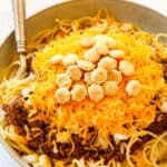 If you haven’t tried Cincinnati Chili before, you are in for a treat! It’s a thick, ground beef meat sauce punctuated by a unique blend of warm, sweet-and-savory spices served not in a bowl but over hot dogs or spaghetti piled with your choice of kidney beans, chopped onions, cheese and/or oyster crackers. Cincinnati Chili is made by virtually dumping the ingredients together in one pot without even browning the meat then simmering until thickened. It might sound odd, but this technique makes for the easiest bowl of comfort food around that’s hearty, aromatic, packed with flavor and can’t-stop-eating delicious – guaranteed. This sensational Cincinnati Chili recipe makes fantastic leftovers (it’s even better the next day) so it’s fabulous for make ahead meals and crowds and it also freezes beautifully for an instant dinner any night of the week.