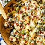 These creamy brussels sprouts with bacon are an easy, one pot side dish that pair beautifully with any holiday or company meal. They are a creamy, cheesy, garlic lovers dream and will have even sworn Brussels sprouts haters licking their plates – plus this recipe is gluten free, low carb and keto! These creamy Brussels sprouts are drenched in a creamy, cheesy, garlic herb sauce topped with Gruyere, mozzarella, and crispy bacon then baked to bubbly perfection. This recipe can be assembled ahead of time then baked when ready for the ultimate stress-free, crowd pleasing dinner or holiday side.