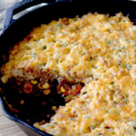 Add garlic and sauté 30 seconds. Sprinkle flour over meat and cook while stirring for 2 minutes. Add remaining Meat/Vegetable ingredients and simmer, stirring occasionally, over medium heat for 7-10 minutes or until thickened. Taste and add additional hot sauce if desired. Spread evenly in skillet.