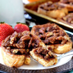 French Toast Bake with Pecan Praline is the only French Toast recipe you will want to make! It is made by coating the bread in egg batter spiked with maple syrup and cinnamon then topped with an easy, decadent mixture of pecans, maple syrup, vanilla, cinnamon, nutmeg, butter, and brown sugar that seeps into the toast as it bakes to create OUT OF THIS WORLD YUM! This French Toast Bake is easy to make with a prep time of only 15 minutes and then bake it in the morning for an effortless special occasion breakfast!