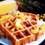 Top waffles with Pineapple Coconut Syrup and toasted macadamia nuts.