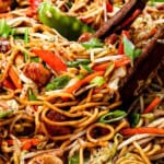 Prepare noodles: For pre-cooked lo mein noodles, run them under hot tap water to separate, then drain well and toss with a drizzle of toasted sesame oil. For uncooked noodles, cook them in a large pot of boiling water until al dente, rinse with cold water, drain thoroughly, then toss with a drizzle of toasted sesame seed oil. Stir fry the chicken: Heat the oil in a large braiser, large stainless steel pan, or wok over medium-high heat. Sear the chicken until deeply golden on each side, then stir-fry until cooked through. Remove the chicken to a plate. Sauté aromatics: Heat another drizzle of oil in the pan. Add the WHITE parts of the green onions and sauté for 1 minute. Add the garlic and ginger, and stir fry for 10-15 seconds.