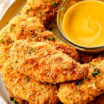 Chicken breasts: chicken tenders are inherently more tender than chicken breasts but you can still use chicken breasts thanks to the tenderizing marinade. To use chicken breasts, slice thick breasts in half through the equator to create cutlets (not necessary for small chicken breasts), pound chicken to an even thickness and then slice them into 2-inch strips. When making your own chicken strips, the key is to try and make them as uniform as possible so you don’t overbake/dry out the smaller pieces while waiting for larger ones to cook through.