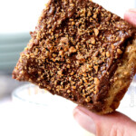 Peanut Butter Cookie Bars are our favorite soft, chewy peanut butter cookies in bar form then slathered in a layer of creamy peanut butter and topped with decadent Butterfinger chocolate frosting! This Peanut Butter Cookie Bars recipe is what dreams are made of.